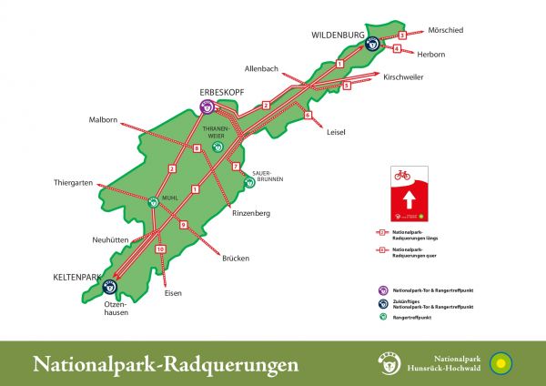 Ein erlebnisreicher Tourtag erwartet Euch auf unserer für Euch getesten Radwege-Kombi: Wir starten am Nationalparktor Erbeskopf und rollen auf Schotter über die Nationalparkquerung Nr. 2 vorbei an Allenbach und Kirschweiler über wunderschöne Waldwege auf unseren Gravelbikes bis ins Nahetal. In Idar-Oberstein angekommen mischen wir uns ins gesellige Treiben der Stadt, bitte auf die mitunter sehr abwechslungsreiche Verkehrsführung mit Einbahnstraßen achten. In Richtung Bahnhof wird es etwas ruhiger und wir erreichen den Naheradweg. Anfangs geht es etwas zackig aus der Stadt raus, bevor wir bald auf ruhigen Wirtschaftswegen an der Nahe entlang in Richtung Birkenfeld fahren. Vor Rimsberg kommt ein schöner Anstieg, der mit Weitblicken über das Birkenfelder Land belohnt. Über das Plateau erreichen wir Birkenfeld. Dort wartet ein Eis im Eiscafe Venezia zur Belohnung. Nun geht es wieder bergauf in Richtung Buhlenberg / Gollenberg auf "halbe Erbeskopf-Höhe". Hier setzen wir uns in die Linie 890, und fahren mit dem Nationalparkbus zum Startplatz am Erbeskopf zurück. Unsere Tips: Vorher den Bus buchen macht es einfacher, Fahrradmitnahme kein Problem! Den Fahrplan könnt Ihr hier einsehen, man kann natürlich auch bereits in Birkenfeld und den folgenden Dörfern einsteigen.