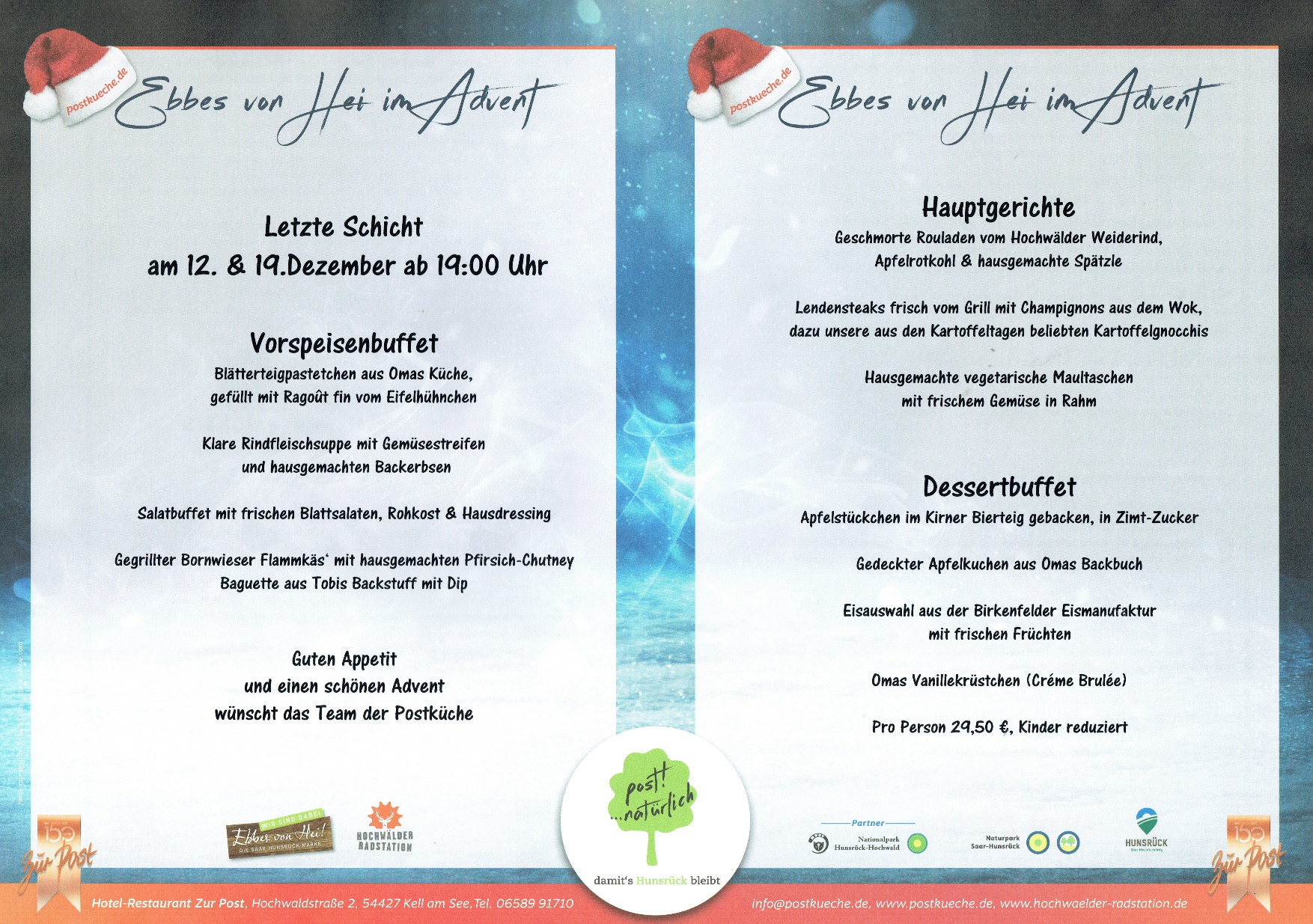 Unsere Gäste wählen aus 4 verschiedenen Menus zwischen 28,50 und 39,50 €. Nach einer servierten Vorspeisenrunde in Form von "Hunsrücker Muffelchen", das sind regionale Köstlichkeiten auf Platten serviert, folgt der ausgewählte Hauptgang, bevor ein Dessertbuffet zum Verlieben lockt..... Beginn 18:30 Uhr!