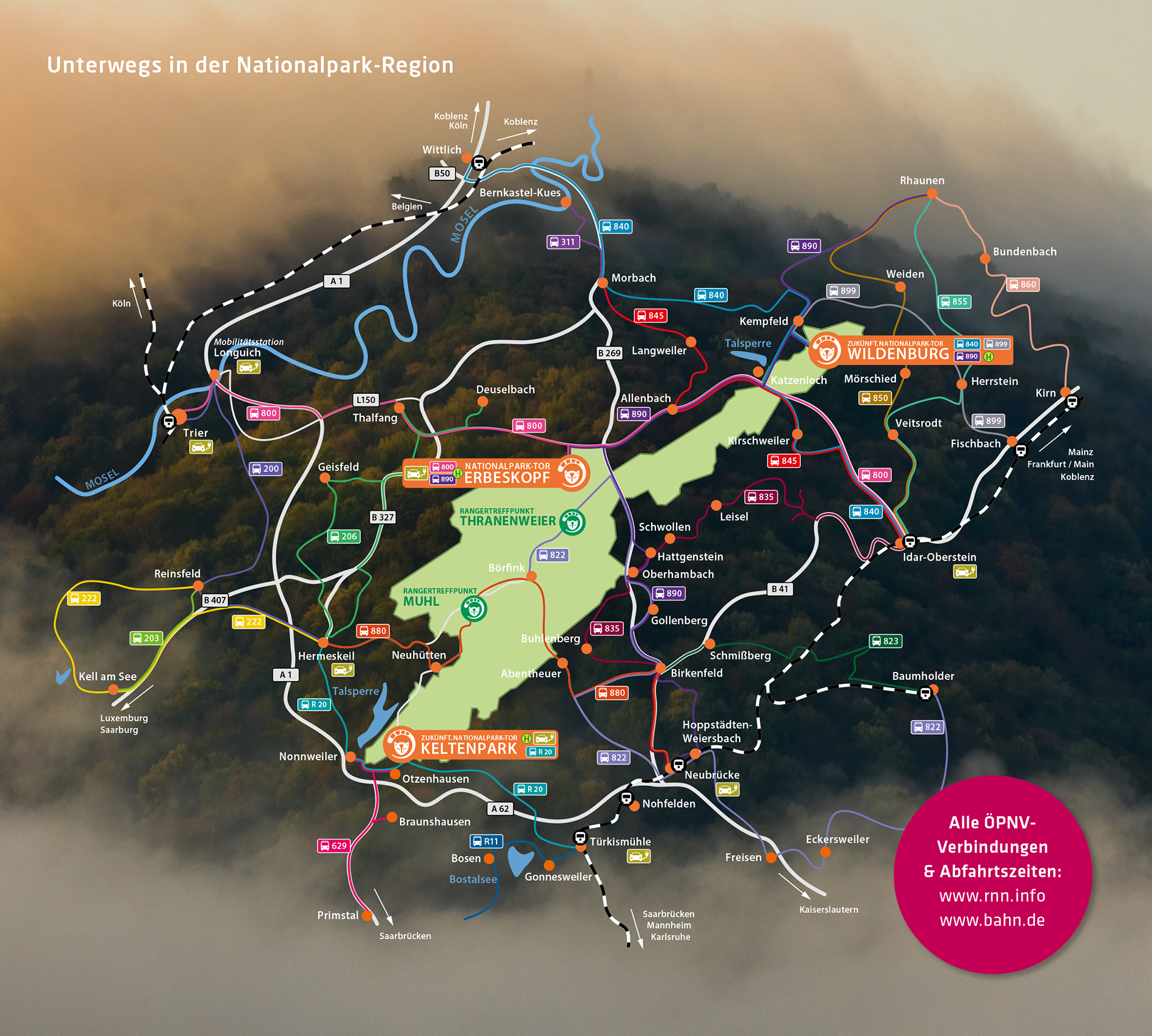 Ein erlebnisreicher Tourtag erwartet Euch auf unserer für Euch getesten Radwege-Kombi: Wir starten am Nationalparktor Erbeskopf und rollen auf Schotter über die Nationalparkquerung Nr. 2 vorbei an Allenbach und Kirschweiler über wunderschöne Waldwege auf unseren Gravelbikes bis ins Nahetal. In Idar-Oberstein angekommen mischen wir uns ins gesellige Treiben der Stadt, bitte auf die mitunter sehr abwechslungsreiche Verkehrsführung mit Einbahnstraßen achten. In Richtung Bahnhof wird es etwas ruhiger und wir erreichen den Naheradweg. Anfangs geht es etwas zackig aus der Stadt raus, bevor wir bald auf ruhigen Wirtschaftswegen an der Nahe entlang in Richtung Birkenfeld fahren. Vor Rimsberg kommt ein schöner Anstieg, der mit Weitblicken über das Birkenfelder Land belohnt. Über das Plateau erreichen wir Birkenfeld. Dort wartet ein Eis im Eiscafe Venezia zur Belohnung. Nun geht es wieder bergauf in Richtung Buhlenberg / Gollenberg auf "halbe Erbeskopf-Höhe". Hier setzen wir uns in die Linie 890, und fahren mit dem Nationalparkbus zum Startplatz am Erbeskopf zurück. Unsere Tips: Vorher den Bus buchen macht es einfacher, Fahrradmitnahme kein Problem! Den Fahrplan könnt Ihr hier einsehen, man kann natürlich auch bereits in Birkenfeld und den folgenden Dörfern einsteigen.