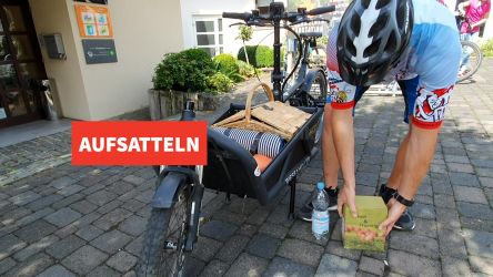 Damit das ohne großen Kraftaufwand funktioniert, packen wir 2 vollgeladene Akkus aufs E - Bike...